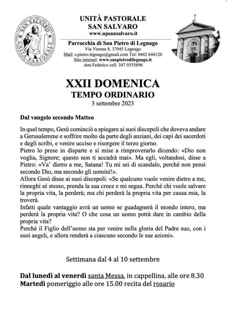 Avvisi Avvisi della settimana – 3 Settembre 2023 2 Settembre 2023 2 Settembre 2023 Un caro saluto a tutti Vi allego gli avvisi Sabato 9 settembre “Festa di fine Estate” Buona Domenica Don Federico